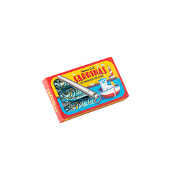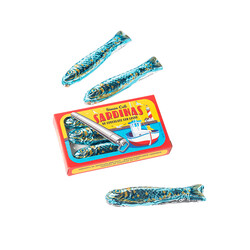 Sardinen aus Vollmilchschokolade, eingewickelt in Alufolie, die das Design einer Pappschachtel simuliert, als wäre es eine echte Sardinendose. Die Schachtel ist ideal für Kinder, die die Schokoladensardinen sicherlich mehr geniessen werden als die echten Sardinen.