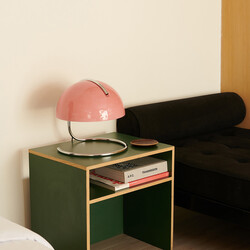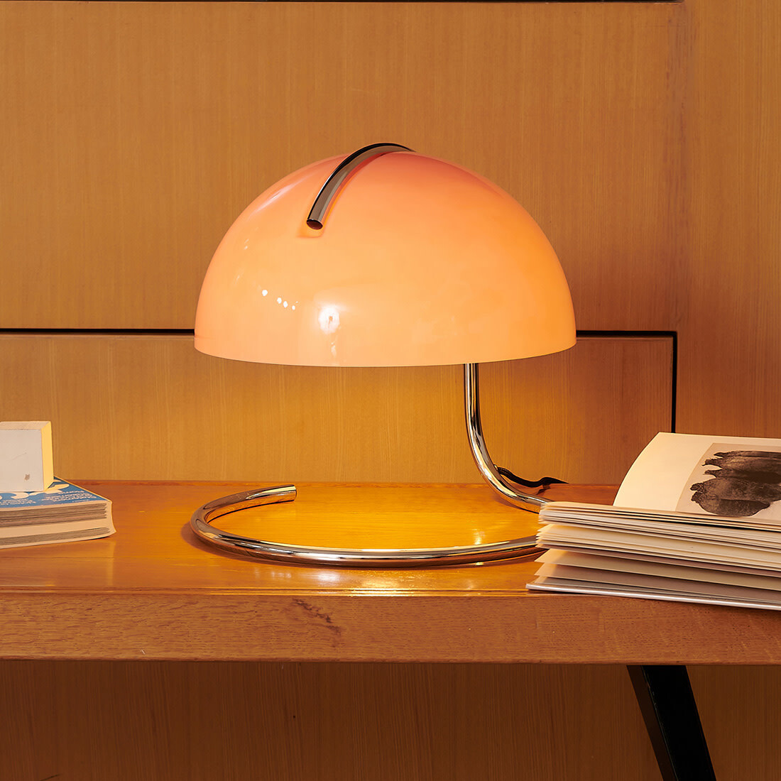 Die Tischleuchte Esme in ihrem auffälligen, verspielten und doch eleganten Design, passt in jedes Interieur. Die Leuchte hat ein elegantes Metallrohrgestell, das sich um den Glasschirm herumwölbt. Das verchromte Rohrgestell im Stil der italienischen Postmoderne der 70er Jahre und die verspielten, leuchtenden Farben machen sie zu einem echten Blickfang.