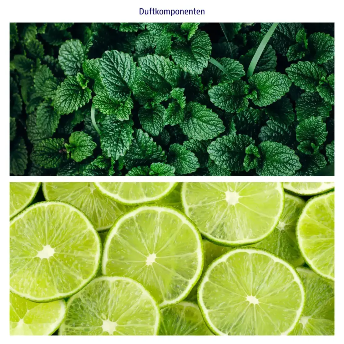 Natürliche Inhaltsstoffe: Aloe Vera-Extrakt, Limettenöl, Mandelöl, Minzöl, Orangenöl, Rosmarinöl, Sheabutter, Sojaöl, Sonnenblumenöl, Zitronenöl