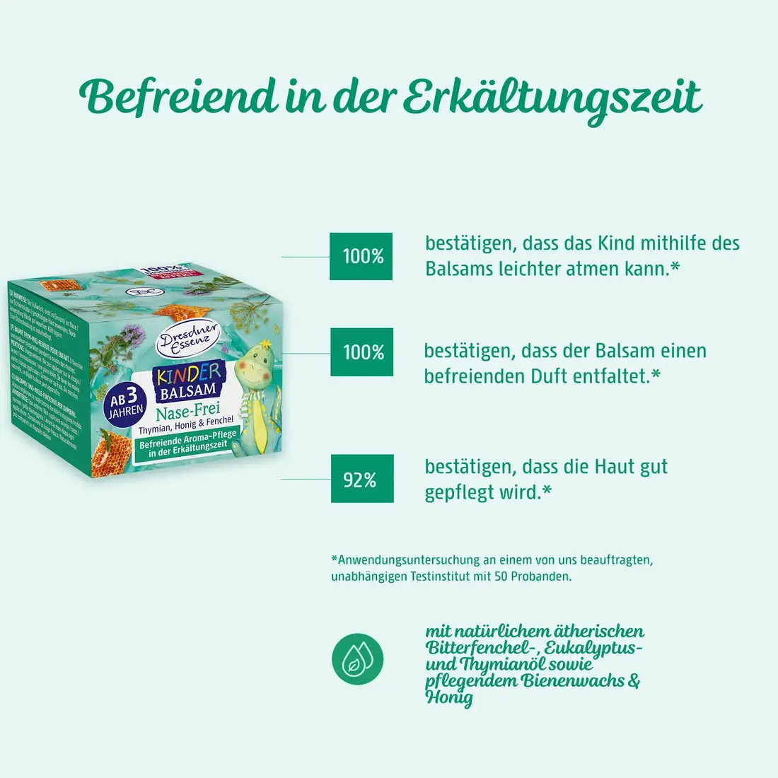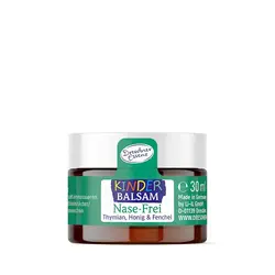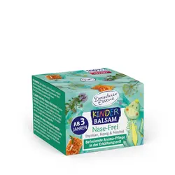 Der Kinder Balsam Nase-Frei wurde speziell für Kinder ab 3 Jahren entwickelt, als Unterstützung in der Erkältungszeit. Die befreiende Aroma-Pflege unterstützt durch den angenehmen Duft von Thymian, Fenchel und Honig ein wohliges Einatmen und wirkt durch den Einsatz von natürlichen ätherischen Ölen befreiend. Massiere den Balsam sanft auf Brust und Rücken deines Kindes ein. Die pflegende Formel schützt und bewahrt die natürliche Hautbarriere.