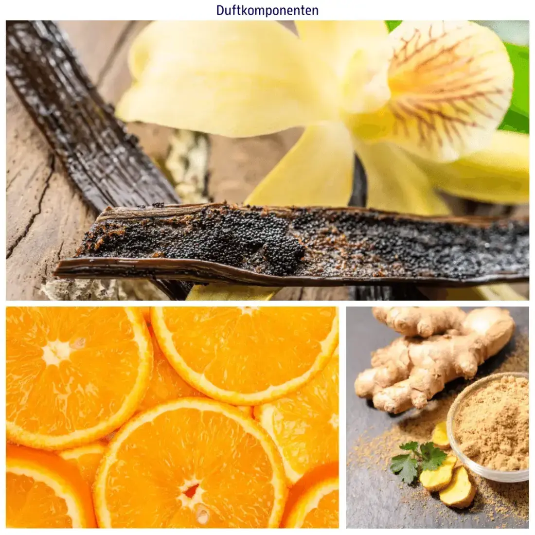 Natürliche Inhaltsstoffe: Ingweröl, Mandelöl, Orangenöl, Rizinusöl