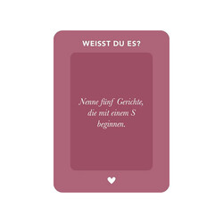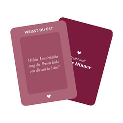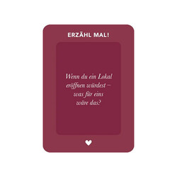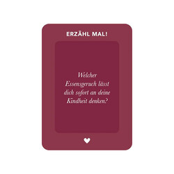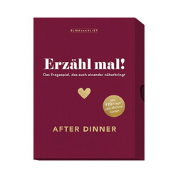 Welcher Essensduft lässt dich an deine Kindheit denken? Was ist der romantischste Ort, an dem du je gegessen hast? Was bestellt James Bond am liebsten zu trinken? «Erzähl mal! After Dinner» ist ein originelles Geschenk für alle, die gerne kochen oder nach dem Essen noch gemütlich zusammensitzen. Das Konversationsspiel fragt nach Lieblingsrezepten, kulinarischen Erinnerungen oder Wissenswertem aus der Küche und führt so zu spannenden und unterhaltsamen Gesprächen mit Familie oder Freunden.