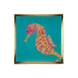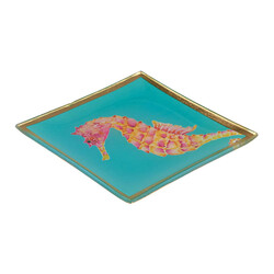 Hol dir maritimen Charme nach Hause. Dieser quadratische Glasteller begeistert mit einem handgemalten Goldrand und einem detailreich gestalteten Seepferdchen auf leuchtend türkisem Hintergrund. Die kräftigen Farben machen ihn zu einem stilvollen Blickfang in jedem Raum. Gefertigt aus hochwertigem Glas, passt der Dekoteller zu verschiedenen Einrichtungsstilen und lässt sich wunderbar mit weiteren Deko-Elementen kombinieren – ideal für dein Wohnzimmer, den Flur oder das Schlafzimmer.