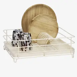 Dieser Geschirrkorb aus Eisen sorgt für ordentliches und effizientes Abtropfen. Die cremefarbene Oberfläche passt sich deinem Küchenstil an, während die robuste Konstruktion für Langlebigkeit sorgt. Die Auffangschale hält deine Arbeitsfläche zuverlässig trocken. Schlicht im Design und praktisch im Alltag – ein funktionaler Helfer für deine Küche.