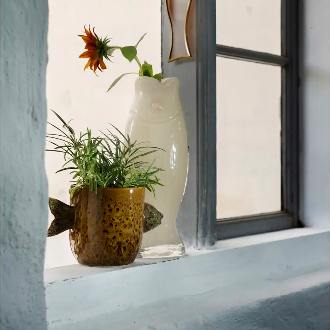 Diese Glasvase in Fischform wird von erfahrenen Handwerkern in China gefertigt und bringt spielerischen Charme in dein Zuhause. Das skulpturale Design ist in zwei Farben und Größen erhältlich und passt perfekt auf Fensterbänke, Regale oder Sideboards. Das mundgeblasene, getönte Glas mit gehämmerter Struktur fängt das Licht sanft ein und macht jede Vase zu einem Unikat. Die weite Öffnung bietet Platz für einzelne Blumen oder üppige Sträuße und schafft eine entspannte, maritime Atmosphäre.