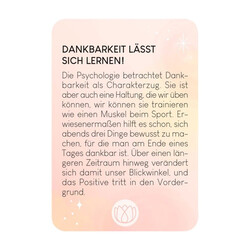 Lerne die kleinen Dinge des Lebens zu schätzen! Dankbarkeit wirkt sich positiv auf unser Wohlbefinden aus, verändert den Fokus und bringt mehr Leichtigkeit in unser Leben. Diese 50 Karten bieten konkrete Anregungen und kreative Impulsfragen, mit denen man lernt, die kleinen Dinge im Leben zu schätzen.