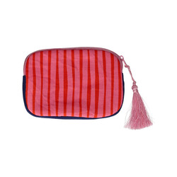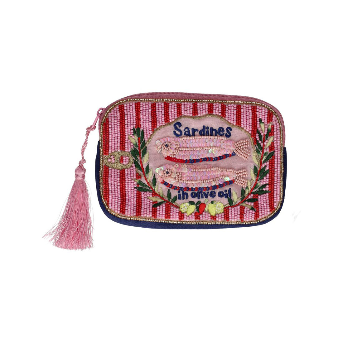 Diese besondere Kosmetiktasche ist ein echter Hingucker. Das detailreiche Design zeigt eine kunstvoll verzierte Sardinendose mit schimmernden Perlen, Pailletten und Stickereien. Die Kombination aus zarten Rosé- und Rottönen, maritimen Motiven und feinen Goldakzenten verleiht der Tasche einen charmanten, verspielten Look. Dank ihrer kompakten Größe bietet sie ausreichend Platz für Make-up, Lippenstift, kleine Pflegeprodukte oder Reise-Essentials. Die Kosmetiktasche ist zudem in einer liebevoll gestalteten Geschenkverpackung verpackt.