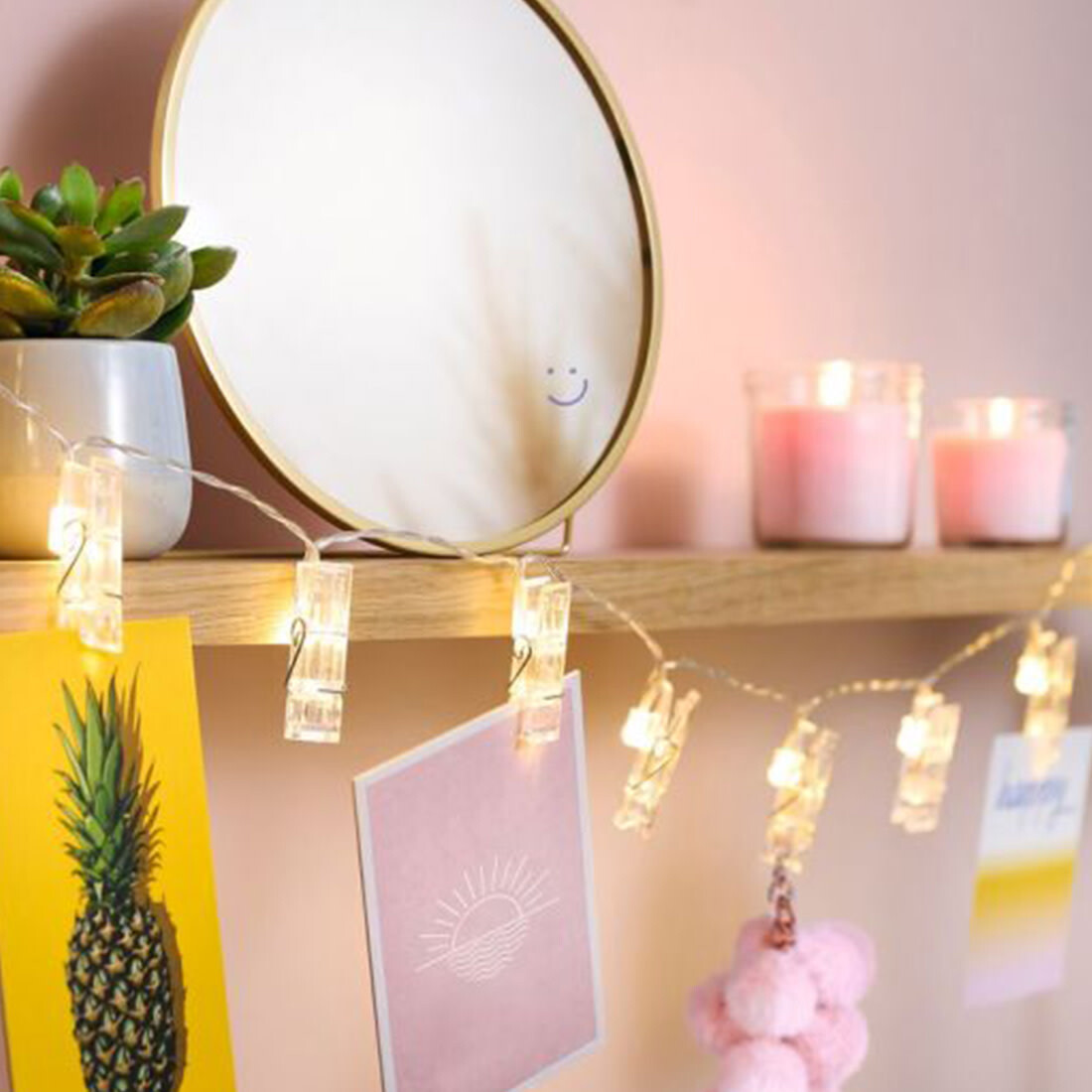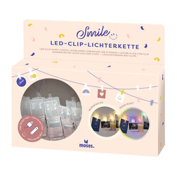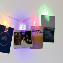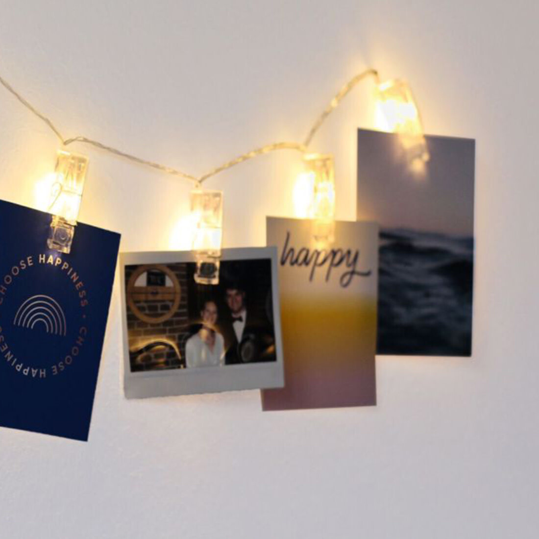 Jederzeit umgeben von den schönsten Erinnerungen: Die Lichterkette mit zehn transparenten, leuchtenden Klammern lässt dich deine liebsten Fotos, Postkarten und Erinnerungsstücke im Handumdrehen aufhängen und beleuchten. Eingeschaltet können die Klammern an der 1,5 Meter langen Kette in zwei Farbmodi erstrahlen: In sanftem warmweißem oder buntem Licht sorgen sie so für pure Wohlfühlstimmung und lassen sich an jede Situation anpassen. Da ein Betrieb der LED-Lichter sowohl per Micro-USB-Kabel als auch per Batterien möglich ist, ist diese Lichterkette sehr flexibel einsetzbar und kann nach Bedarf auch ganz ohne Steckdose oder mit wiederaufladbaren Batterien genutzt werden.