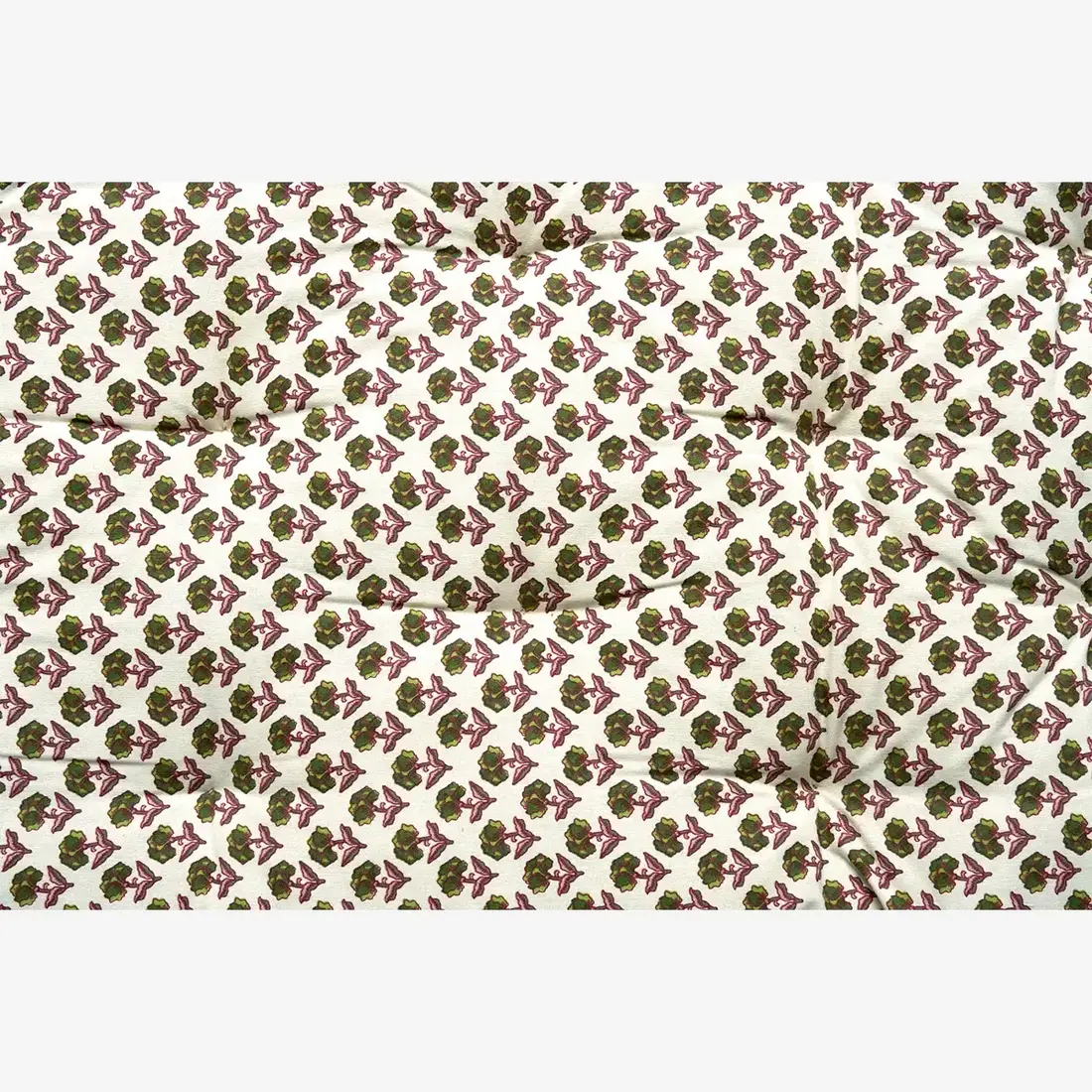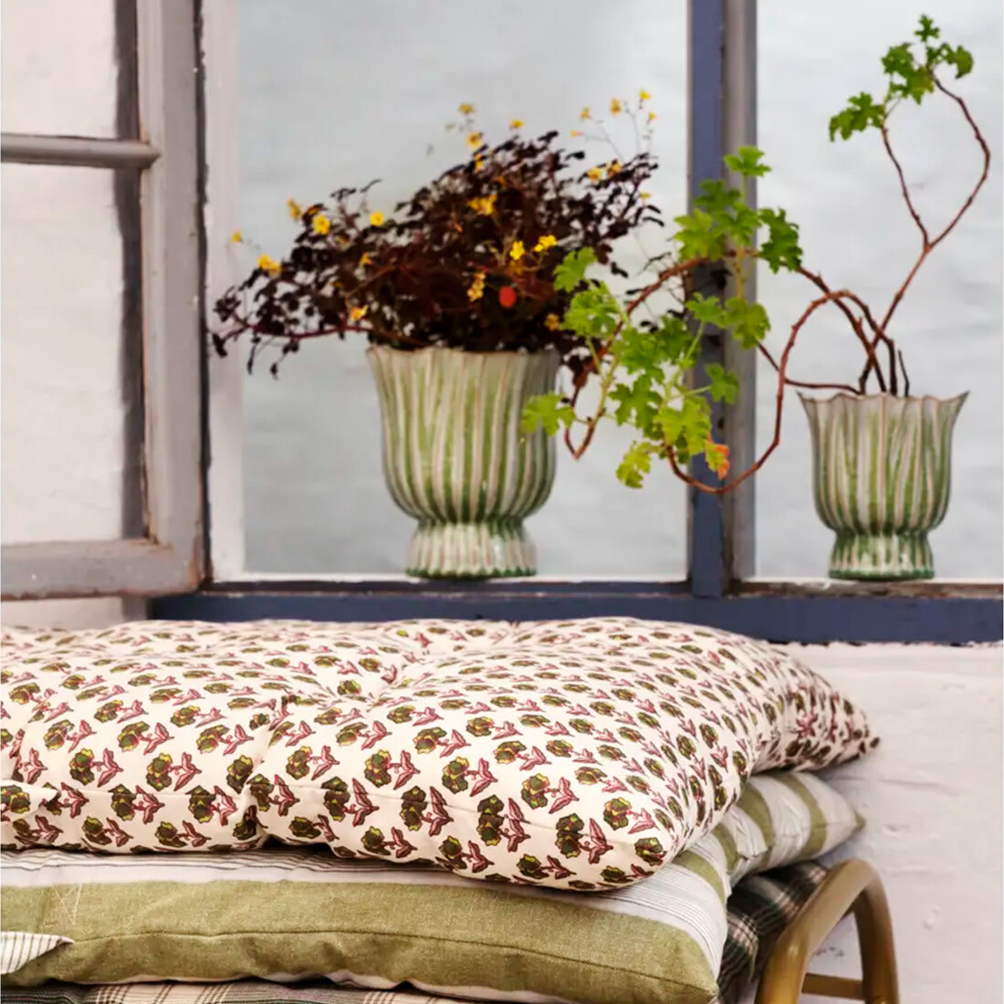 Weiche Baumwollmatratze mit klassischem Print. Diese weiche Matratze aus bedruckter Baumwolle bringt mit dem typischen Madam-Stoltz-Print, inspiriert von indischen Farben und Mustern, sanfte Sommertöne in dein Zuhause. Ob auf dem Tagesbett, Sofa, Boden oder der Terrasse – sie ist vielseitig einsetzbar und schafft gemütliche Rückzugsorte. Die Farbkombination aus Off-White, Grün und Burgunderrot passt zu modernen wie auch klassischen Einrichtungen. Passend dazu sind auch Kissenbezüge und Stuhlkissen erhältlich. Natürlich & nachhaltig. Der robuste Baumwollbezug und die Füllung aus recycelten Baumwollstoffresten sorgen für angenehmen Komfort und einen nachhaltigen Touch. Das von indischen Blockdrucken inspirierte Muster verleiht deinem Raum eine handwerkliche, authentische Note – perfekt zum Entspannen, Lesen oder für Gäste.
