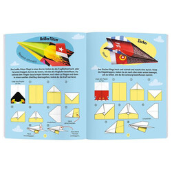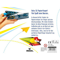 Inhalt: 32 Papierflieger in zwei Größen zum Selberfalten. Anleitungsbuch mit einfachen Faltanleitungen. Stickerbogen für kreative Gestaltung. Startrampe mit Gummiband für weite Flüge.