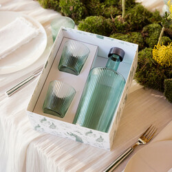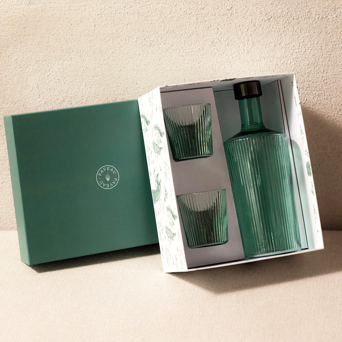 Wir präsentieren das elegante Bondi-Geschenkset: eine edle Flasche und zwei schicke Gläser, wunderschön verpackt in einer schönen Geschenkbox. Mit dieser Wasserflasche von Paveau vervollständigst du nicht nur das stilvolle Ambiente an deinem Tisch, sondern du leistest auch einen Beitrag für unseren Planeten. Fülle deine wiederverwendbare Flasche mit Wasser oder einem anderen Lieblingsgetränk. Die Glas-Design-Flasche ist leicht, hat einen Twist-off-Verschluss, besticht durch ihr stilvolles und langlebiges Design, ist mundgeblasen. Ein einzigartiger Einrichtungsgegenstand mit Herz für die Natur.