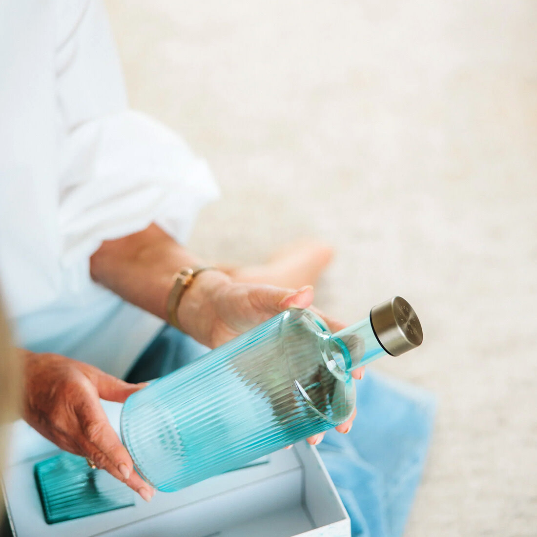Wir präsentieren das elegante Lucky-Geschenkset: eine edle Flasche und zwei schicke Gläser, wunderschön verpackt in einer schönen Geschenkbox. Mit dieser Wasserflasche von Paveau vervollständigst du nicht nur das stilvolle Ambiente an deinem Tisch, sondern du leistest auch einen Beitrag für unseren Planeten. Fülle deine wiederverwendbare Flasche mit Wasser oder einem anderen Lieblingsgetränk. Die Glas-Design-Flasche ist leicht, hat einen Twist-off-Verschluss, besticht durch ihr stilvolles und langlebiges Design, ist mundgeblasen. Ein einzigartiger Einrichtungsgegenstand mit Herz für die Natur.