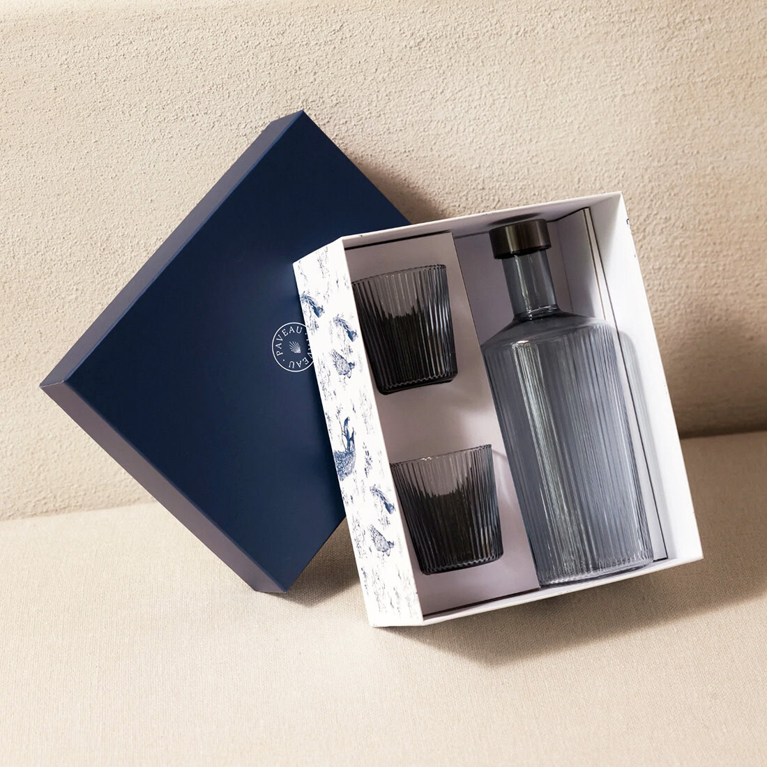 Wir präsentieren das elegante Twilight-Geschenkset: eine edle Flasche und zwei schicke Gläser, wunderschön verpackt in einer schönen Geschenkbox. Mit dieser Wasserflasche von Paveau vervollständigst du nicht nur das stilvolle Ambiente an deinem Tisch, sondern du leistest auch einen Beitrag für unseren Planeten. Fülle deine wiederverwendbare Flasche mit Wasser oder einem anderen Lieblingsgetränk. Die Glas-Design-Flasche ist leicht, hat einen Twist-off-Verschluss, besticht durch ihr stilvolles und langlebiges Design, ist mundgeblasen. Ein einzigartiger Einrichtungsgegenstand mit Herz für die Natur.