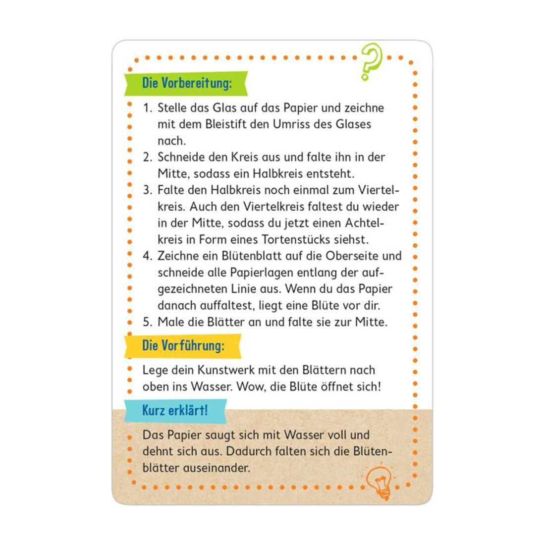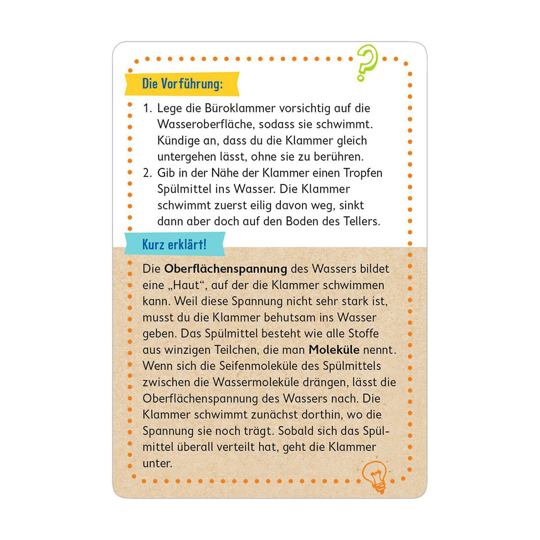 Wissenschaft als Zaubershow: Kann man ein Taschentuch unter Wasser drücken, ohne dass es nass wird? Oder ein Ei durch einen engen Flaschenhals in eine Glasflasche zaubern? Diese und weitere magische Tricks können mit diesem Kartenset einstudiert und einem verblüfften Publikum vorgeführt werden - wissenschaftliche Erklärung inklusive! In den 75 supercoolen Show-Experimente können junge Forscher und Entdeckerinnen spannende Phänomene der Wissenschaft entdecken und in spektakulären Experimenten ausprobieren. Fast alles, was man für die coolen Experimente braucht, findet man zu Hause. Jede Karte enthält ausführliche Erklärungen zum jeweiligen wissenschaftlichen Phänomen, sodass Kinder nicht nur jede Menge Experimentierspaß haben, sondern auch viel Neues lernen können.