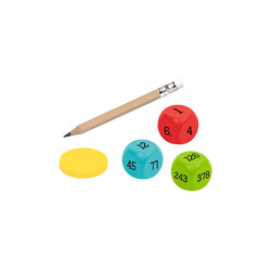 Inhalt: Mathe-Zaubertrick zum kleinen Einmaleins, Würfel, Holzplättchen und Anleitung