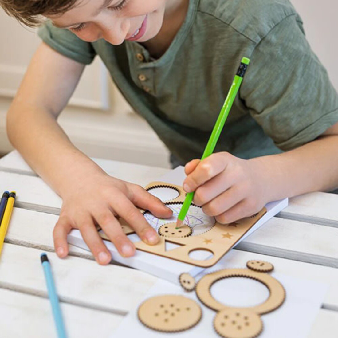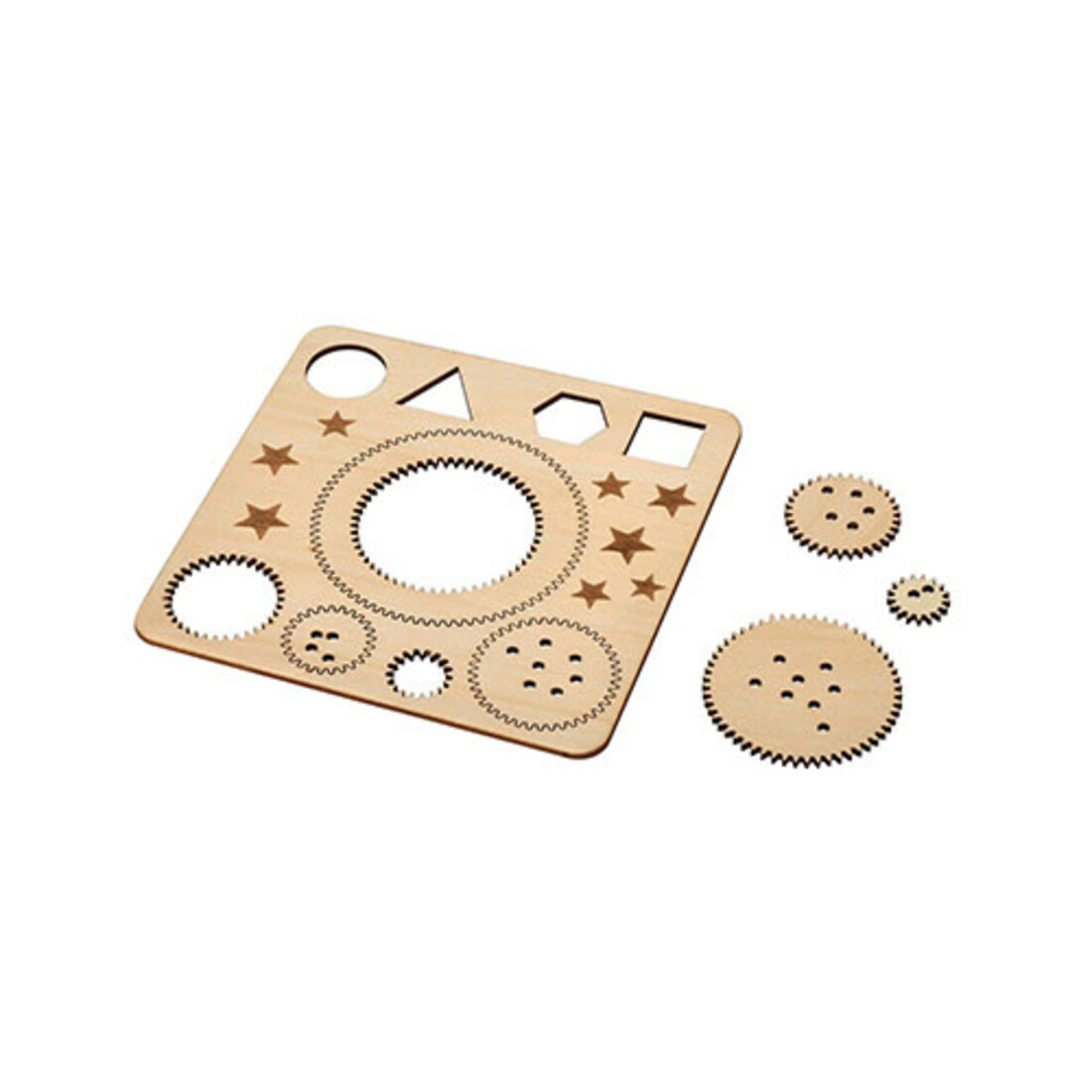 Lieferumfang: 1 Spirograph mit 5 Zahnrädern, 4 geometrische Schablonen, Anleitung