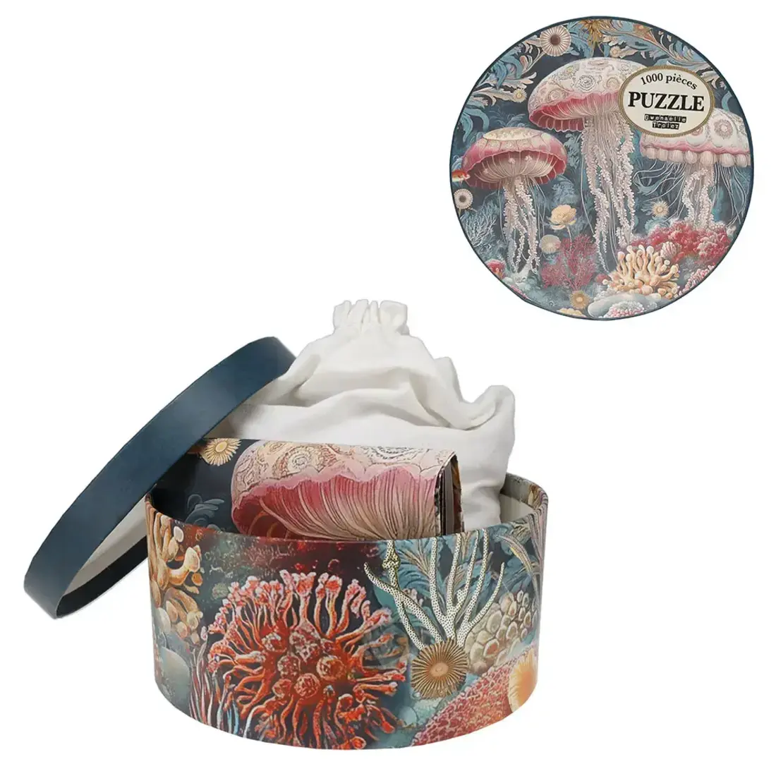 Tauche ein in eine illustrierte und poetische Welt mit diesem 1000-teiligen Puzzle. Präsentiert in einer eleganten runden Schachtel, ist es ein schönes Objekt zum Verschenken, Sammeln oder Umfunktionieren.
