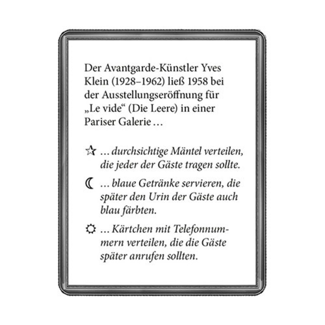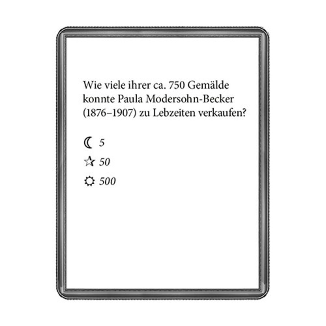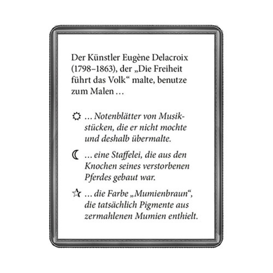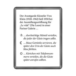 Welchen Nebenjob hatte Paul Gauguin, wie viele Messerattacken überstand van Goghs „Nachtwache“, welche Künstler waren berüchtigt für ihre Freundschaft und zugleich für ihre Feindschaft? Informativ und unterhaltsam entführt dieses Quiz mit 40 illustrierten Fragen auf eine spannende Reise durch die faszinierende Welt der Kunst. 40 spannende Quizfragen aus der faszinierenden Welt der Kunst Das perfekte Geschenk für Kunst-Fans Alleine oder in beliebig grossen Gruppen spielbar.