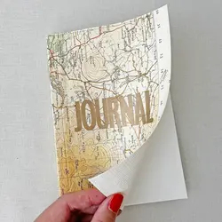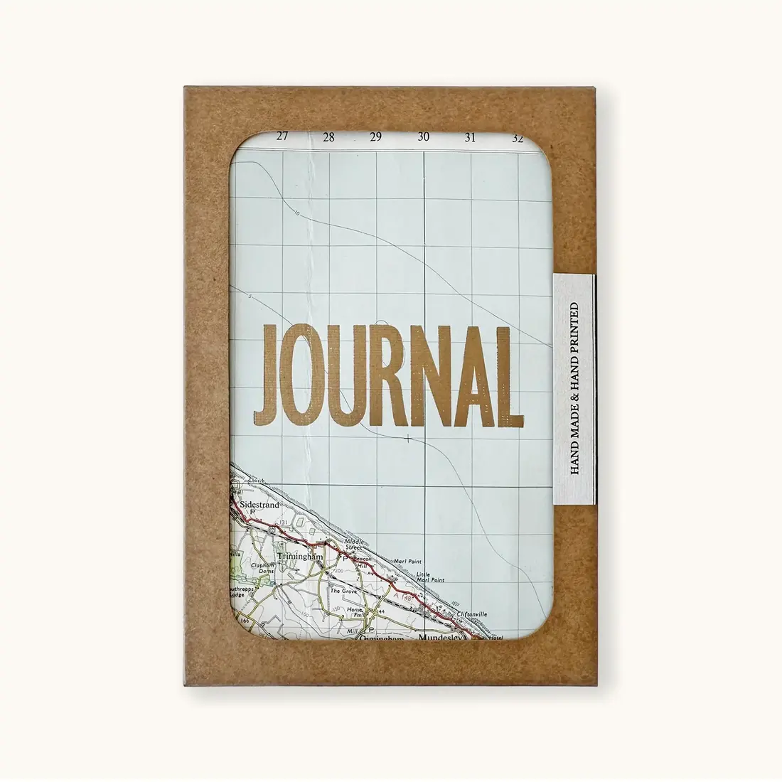 Wundervolles Reisetagebuch mit einem goldenen Buchdruckumschlag, hergestellt aus einer originalen Vintage-Leinenkarte. Jedes Buch ist anders und stammt aus den 1920er bis 1960er Jahren. Enthält eine Auswahl an unbedruckten und linierten Seiten, mit Kraftumschlägen und Taschen, die in die Bindung eingenäht sind – bietet viel Platz zum Schreiben, Skizzieren, Collagieren und Sammeln.