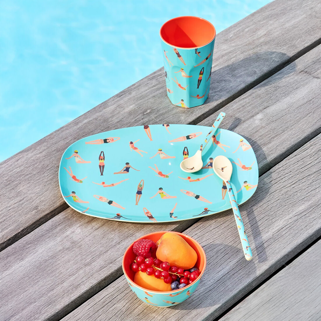 Sommerlicher rechteckig-ovaler Teller mit «Retro Swimster» Print. Er besteht aus Melamin, einem robusten Material, das dank seiner Strapazierfähigkeit und einfachen Reinigung ideal für den täglichen Gebrauch ist. Das macht den Teller gleichermaßen praktisch und einzigartig.