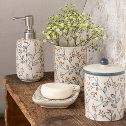 Die handgefertigte Aufbewahrungsdose mit filigranen, floralen Prints ist eine zarte Schönheit für dein Bad. Erlebe die feine Eleganz unserer handgestempelten Aufbewahrungsdose mit Prints im floralen Muster. Jedes Detail wurde kunstvoll entworfen und verleiht der Dose eine einzigartige Raffinesse. Kombiniere die Aufbewahrungsdose harmonisch mit anderen passenden Bad-Accessoires, um ein stimmiges und ansprechendes Gesamtbild in deinem Badezimmer zu schaffen und deine Accessoires stilvoll zu verstauen. Erfahre den Luxus von sorgfältig gestalteten Details und verleihe deinem Bad eine romantische Note.