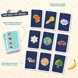 Besonderheiten: Schnelles Reaktions- und Vergleichsspiel, schult visuelle Wahrnehmung und Konzentration, trainiert Größenrelationen und Koordination, mit kindgerechten, klar illustrierten Motiven