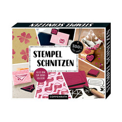 Alles-drin-Starter-Set für individuelle Stempel zum Selbermachen mit Stempelplatten, Schnitzwerkzeug, Anleitung, 15 Vorlagen und Stempelkissen zum Sofort-Loslegen.