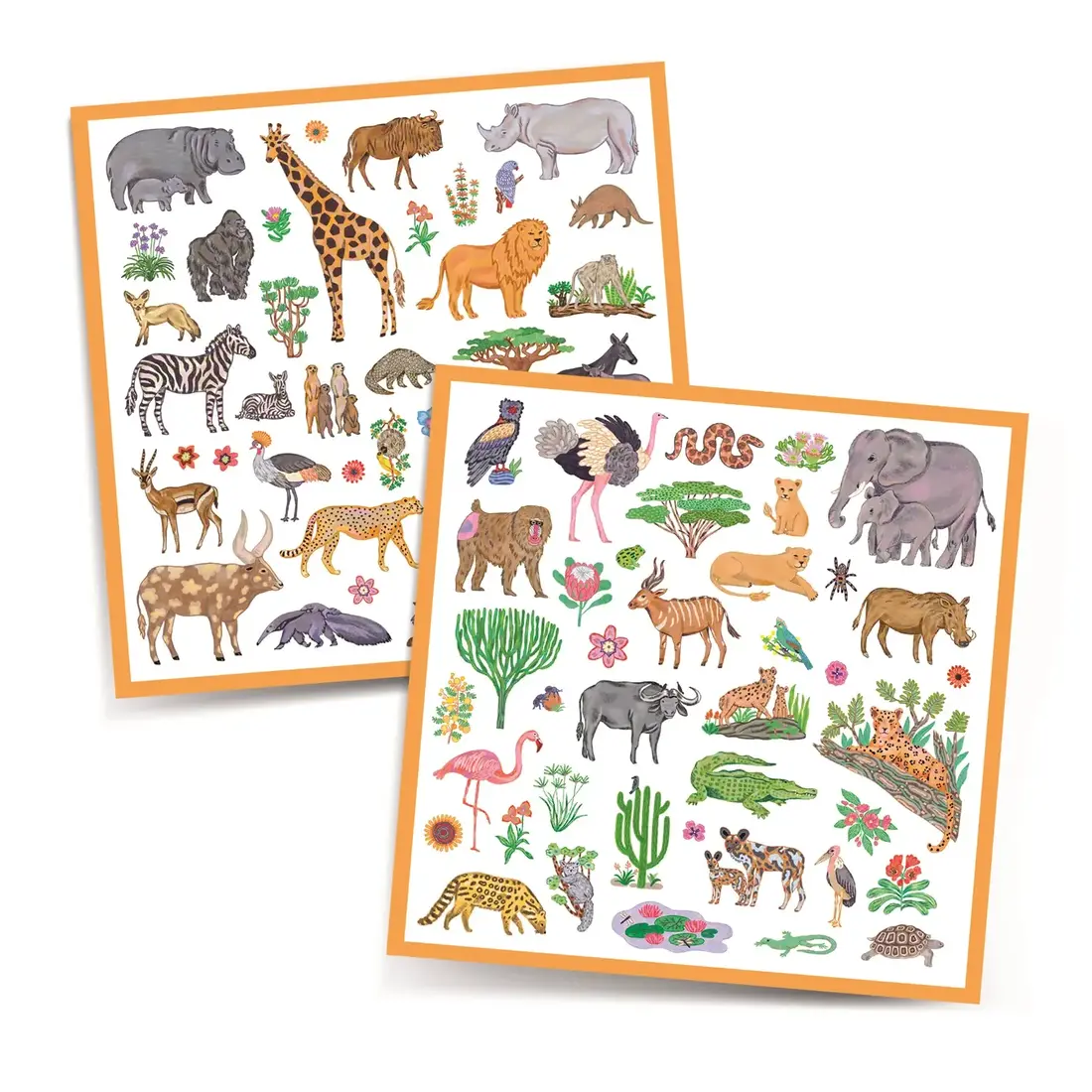 Dieses Set bringt Kindern die faszinierende Tierwelt Afrikas näher – vom majestätischen Löwen und Zebra bis hin zu exotischen Tieren wie Turakos, Bongo und Watussirind. Die 160 detailreichen Papiersticker können ganz nach Belieben aufgeklebt werden, um wilde Landschaften zu gestalten oder als Dekoration zu dienen.