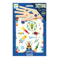 Leuchtende "Rocketship through Space"-Tattoos. Zur größten Freude der Kids erscheinen im Dunkeln Überraschungen und kleine phosphoreszierende Details! Die vorgeschnittenen temporären Tattoos sind einfach anzuwenden und werden mit etwas Wasser aufgetragen. Dermatologisch getestet.