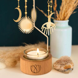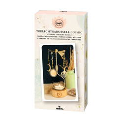 Gemütliche Stimmung in den eigenen vier Wänden ist mit diesem Teelicht-Karussell Cosmic garantiert. Das Karussell spendet wohlig-warmes Licht und zaubert dank der sich drehenden Metall-Anhänger in spirituellen Formen wie Sonn, Mond oder Auge funkelnde Lichtreflexe in dem Raum.