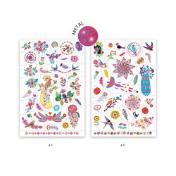 Zwei Bögen mit märchenhaften Vogelsujets! Zur Freude der Kinder sind sie mit metallischen Details verziert! Für eine einfache Anwendung sind sie vorgestanzt und werden mit etwas Wasser aufgetragen. Dermatologisch getestet!