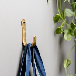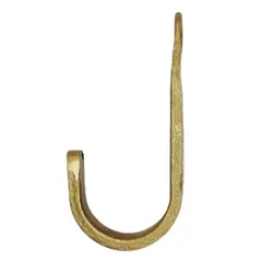 Vielseitiger und starker Einzelmantelhaken in Messing-Gold. Authentischer Haken aus Schmiedeeisen, perfekt, um jedem Raum einen industriellen Touch zu verleihen. Handgeschmiedet von erfahrenen Kunsthandwerkern in Indien. Jeder Haken ist ein Unikat.